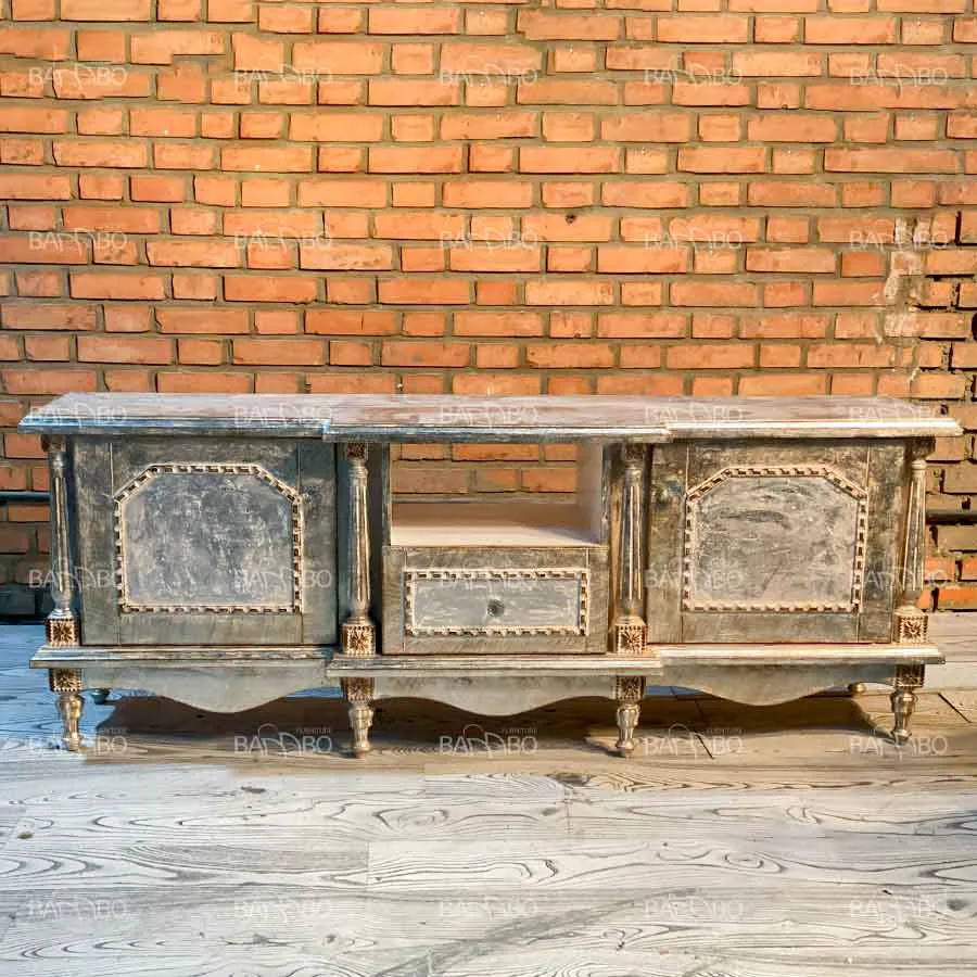 رنگ نقره‌کوبی استفاده‌شده در این میز، جلوه‌ای لوکس و اشرافی به آن می‌بخشد. این نوع پرداخت با انعکاس نور، عمق و زیبایی بیشتری به فضا می‌دهد و باعث می‌شود میز تی وی به نقطه کانونی نشیمن تبدیل شود. نقره‌کوبی ظریف به‌خوبی با سایر آیتم‌های دکوراتیو مانند میز جلو مبلی هماهنگ می‌شود و حس یکپارچگی را تقویت می‌کند.