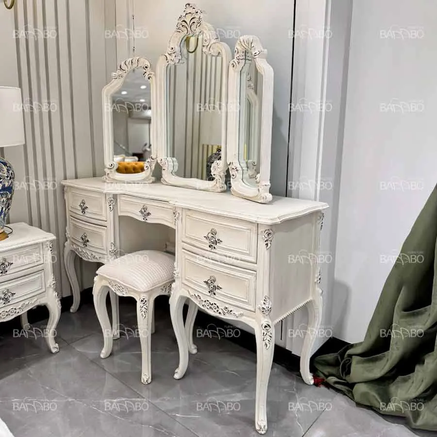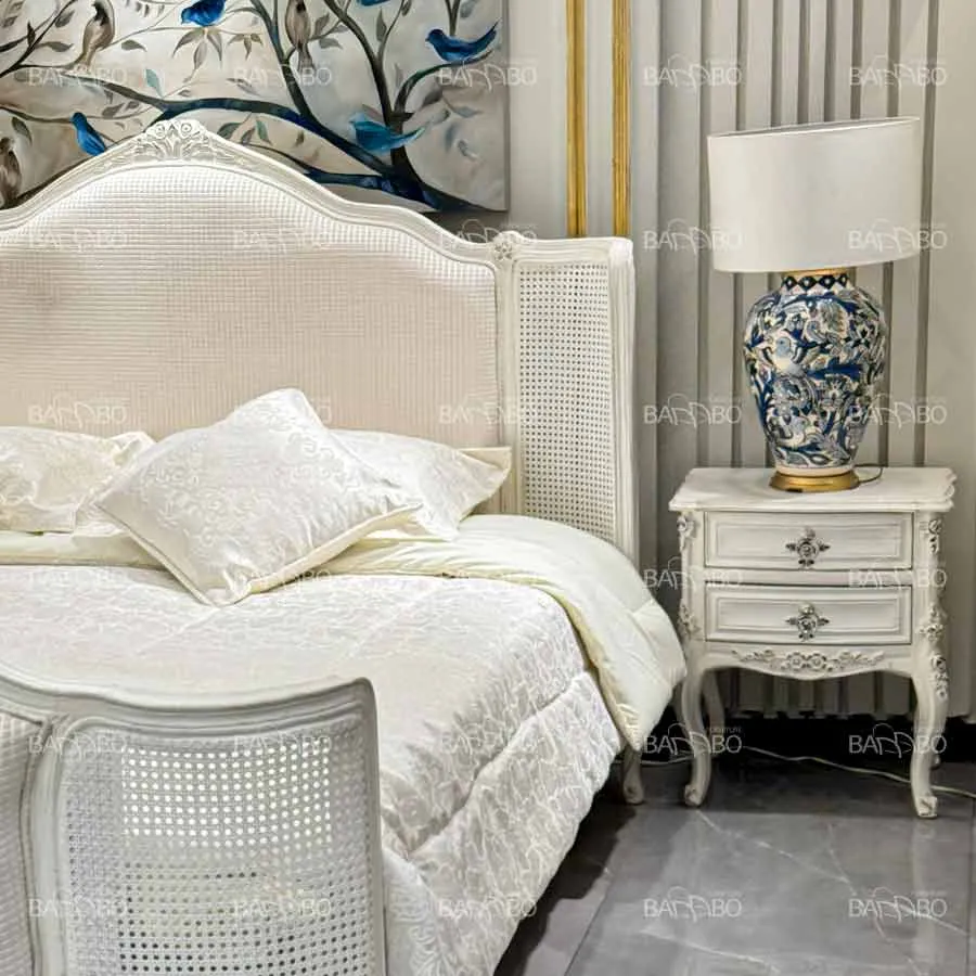 رنگ اصلی کار به صورت سندبلاست پتینه اجرا شده است. این نوع رنگ‌آمیزی، جلوه‌ای خاص و هنری به چوب می‌بخشد و با ایجاد بافتی ملایم و طبیعی، حس اصالت و لطافت را در فضا تقویت می‌کند. ترکیب رنگ سفید پتینه با طراحی کلاسیک، فضایی دلباز و روشن ایجاد می‌کند که برای اتاق‌های بزرگ و حتی متوسط بسیار مناسب است.