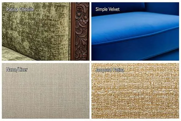 چوبِ مبل کلاسیک، ماهیتی سخت، فرم‌دار و اغلب براق دارد. وقتی این چوب را در کنار پارچه پتینه که ماهیتی نرم، مات و دارای بافت عمیق دارد قرار می‌دهیم، تعادلی ایجاد می‌شود که چشم را خسته نمی‌کند.